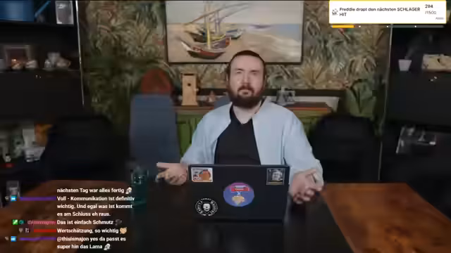 00:06:34Der Stream beginnt mit einem verspäteten Start und einer lockeren Begrüßung. Der Streamer erklärt seine Abwesenheit aus dem Vorfeld und berichtet von einem langen Drehtag, bei dem neun Speisen für Dinner Duel wurden aufgenommen. Es folgen erste Anspielungen auf bevorstehende Events wie den ZDF Fernsehgarten und Rock am Ring, die als Etappenziele für die nächste Zeit dienen.