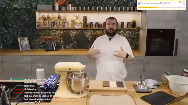 03:43:28Der Backprozess beginnt mit dem Abwiegen der Zutaten. Der Streamer teilt seine persönliche Meinung zum Backen aus: Es sei im Gegensatz zum Kochen weniger intuitiv und erfordere mehr Genauigkeit und Einhaltung von Regeln. Während Kochen Fehler verzeihe, sei beim Backen jede Abweichung kritisch. Trotzdem wird mit der Vorliebe für die KitchenAid-Mixmaschine und der Freude am gemeinsamen Backen im Stream betont, dass es sich entspannt anfühlt.