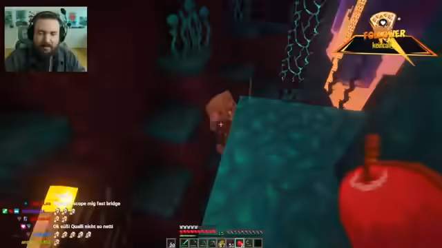 02:52:33Die Expedition im Nether wird spannender. Er handelt erfolgreich mit Zombie-Pigmen, indem er ihnen Goldnuggets anbietet, und erhält im Gegenzug verzauberte Bücher und Pfeile. Es kommt zu einem gefährlichen Kampf mit einem Ghast, den er nach anfänglichen Schwierigkeiten mit seinem Schwert zurück ins Lava-Seelenfeuer schleudern kann. Anschließend erkundet er karmesin- und purpurfarbene Wälder, in denen er größere Schweine findet.