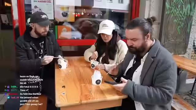 02:14:19Die Gruppe diskutiert über die Möglichkeit, einen veganen Burger anzubieten, wobei betont wird, dass die Entwicklung und Konzeptionierung von veganen Optionen Zeit braucht. Anschließend werden Cookies probiert, die als 'Bomben' und 'Mehlzucker und Wunder' beschrieben werden. Besonders hervorgehoben wird ein Blueberry Cheesecake Cookie, der als ungewöhnlich und lecker empfunden wird. Es wird das Fehlen von Milchshakes im Angebot des Ladens bemängelt, obwohl diese in anderen Filialen erhältlich sind. Die kulinarische Tour durch Berlin soll fortgesetzt werden, um Vanessa, einer Berlinerin, die lokale Esskultur näherzubringen. Nach dem YouTube-Video kehrt die Gruppe zum Live-Stream zurück und startet einen Mukbang mit den Burgern. Die Marketingabteilung des Ladens soll kontaktiert werden. Es wird überlegt, ob man in Berlin einfach so rumgehen und streamen könnte. Timo wird erwähnt und seine Bedeutung für die Gruppe hervorgehoben. Es wird über Yoga-Streams und den Erfolg von Frauen auf Twitch diskutiert, wobei Klischees und Vorurteile angesprochen werden. Ein Chat-Vorschlag führt dazu, dass die Gruppe einen bestimmten Laden besucht und dort isst. Die Frische und Knackigkeit der Jalapeños werden erneut gelobt. Es wird spekuliert, ob die Jalapeños roh oder 'Candy-mäßig' sind.