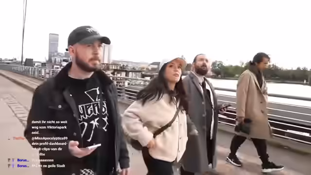 00:51:25Auf dem Weg zum Treffpunkt stoßen die Streamer zufällig auf eine Filmproduktion an der Spree. Sie beobachten das Geschehen mit Neugier und scherzen über die möglichen Zusammenhänge. Julian erkundigt sich interessiert nach den genutzten Mikrofonen, während über Kooperationen und Placements mit Marken wie Emmer gesprochen wird.
