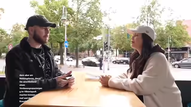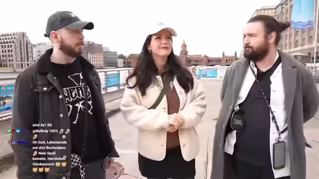 00:51:31Es wird angekündigt, dass unten an der Spray entlanggelaufen wird und da auf uns gewartet wird. Es wird jetzt ein schönes Zustolz hier geben und das ein bisschen wie bei Eggs on the Beach. Es wird überlegt, ob die Ex eingeladen wurde und die steht so da. Es wird ein Ex-on-the-Beach-Walken gemacht. Es wird überlegt, ob die Berliner Mannequin Lochfiguren sind. Es wird überlegt, ob ein Emmer Placement gemacht wird. Es wird überlegt, ob Volt besucht wird. Es wird überlegt, wer Uber Eats gegründet hat. Es wird überlegt, ob das schon jemand sein könnte, der mit dem Rücken zu uns steht. Es wird überlegt, ob es Wein oder die Ex ist. Es wird überlegt, wie man reagiert, wenn man dran vorbei geht und von der Seite guckt. Es wird gezählt und alle drehen sich gleichzeitig um. Der Special Guest wird abgeholt und mit einem Mikrofon ausgestattet. Es wird sich gefreut, dass die weibliche Energie für zwei da ist. Es wird sich gefreut, dass Duis die Ur-Berlinerin ist.