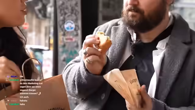 02:02:05Zu Beginn probieren die Streamer einen Burger im Lokal Bürgermeister. Sie diskutieren über die Zutaten, insbesondere über die frischen Jalapenos, die als besonderes Highlight gelten. Die Konsistenz der Pommes wird gelobt, aber auch erwähnt, dass es für sie persönlich zu laut im Lokal ist. Die Bewertung fällt sehr positiv aus, der Burger erhält eine 10 von 10.