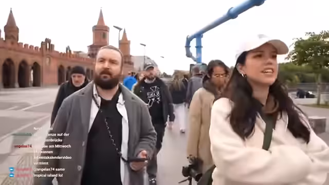 02:28:22Die Streamer beginnen einen Spaziergang durch Berlin und kommen an der Eastside Gallery vorbei. Sie erkunden die Gegend und machen Fotos an der Berliner Mauer. Dabei wird über die Geschichte der Mauer, die Unterschiede zwischen Ost und West Berlin und das lokale Ampelmännchen gesprochen. Die Route führt sie auch vorbei an der U-Bahn-Station Warschauer Straße und der East Side Mall.