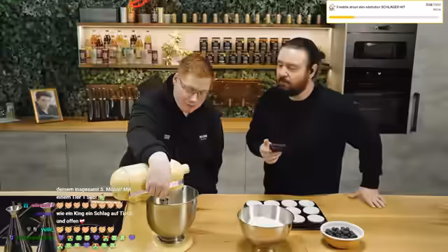 02:35:50Der Stream beginnt mit einer spontanen Entscheidung, gemeinsam etwas zu backen, was ursprünglich als komplexe Torte geplant war. Die spontane Wahl fällt auf das Backen von Muffins. Gemeinsam wird ein Teig mit Blaubeeren zubereitet, wobei ein starker Fokus auf präzises und schnelles Arbeiten innerhalb einer vorgegebenen Zeit von 30 Sekunden gelegt wird. Der Prozess wird von humorvollen Anekdoten und einer leicht chaotischen, aber erfolgreichen Atmosphäre geprägt.