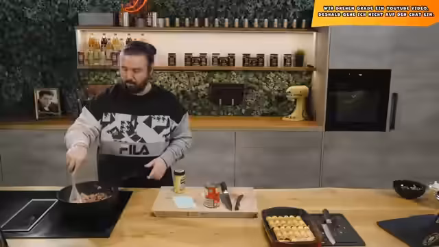 03:28:23Nachdem die gefüllten Cannelloni vorbereitet sind, wird nun die Bolo-Sauce zubereitet. Dafür werden Zwiebel, Möhre und Knoblauch kleingeschnitten. Der Streamer brät das Hackfleisch an, würzt es mit Bolo-Gewürz und gibt das Gemüse hinzu. Die Sauce soll kurz mitbrutzeln, um ihre Aromen zu entwickeln. Ein Zuschauer erwähnt ein gestohlenes Design der Messer, was zu einem kurzen Dialog über den Vertrieb der eigenen Kochutensilien führt.