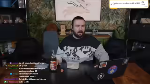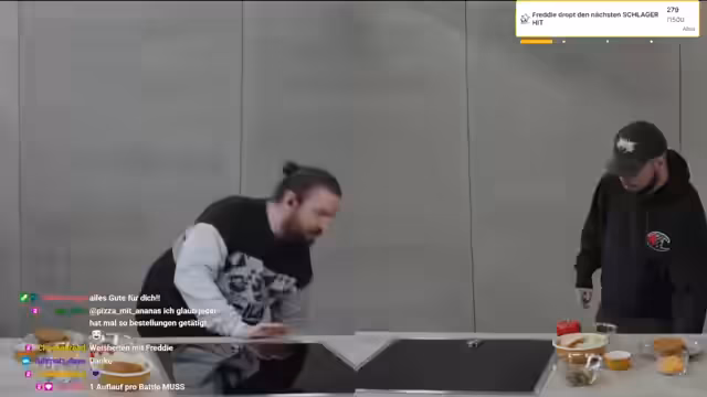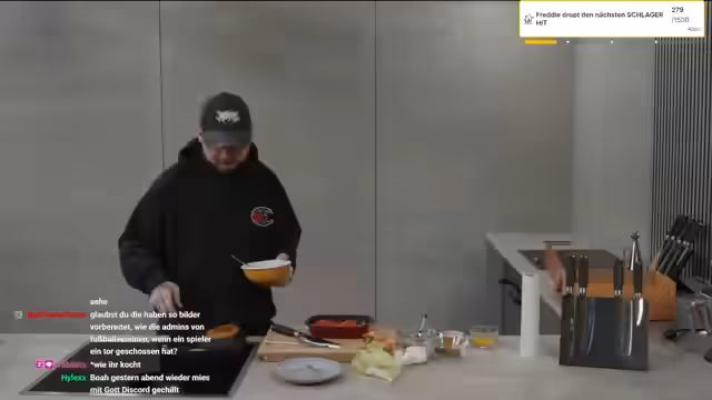 06:01:31Nach einer Pause beginnt das eigentliche Kochduell, das als "Brunch Show // YT Dreh // Kochduell vs Düs" angekündigt wurde. Der Streamer bittet das Publikum, Wetten auf den Ausgang des Duells abzuschließen, wobei es Waffelpunkte als Einsatz gibt. Die Wette ist sehr ausgeglichen, mit hohen Einsätzen auf beide Seiten. Währenddessi ert tauchen ungewöhnliche Kommentare auf, wie eine persönliche Nachricht über eine Beziehungskrise, für die der Streamer professionelle Hilfe wie die Telefonseelsorge vorschlägt.