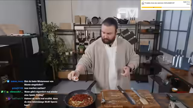 00:51:20Nach der Schulstunde wird die Zubereitung der Chili Cheese Fries fortgesetzt. Hackfleisch wird in Olivenöl angebraten und mit Tomatenmark, Chiliflocken, Zwiebeln und Knoblauch gewürzt. Während des Kochens kommt es zu technischen Störgeräuschen und der Streamer gibt einen kurzen Einblick in die Ausstattung seiner Produktionshalle. Anschließend werden die vorgeheizten Frites aus dem Ofen genommen.