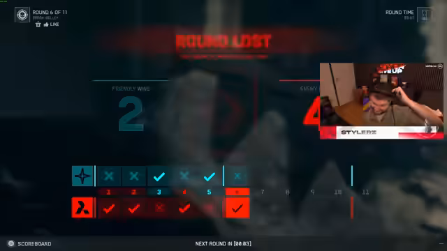 03:35:27Die Situation im Strike Point-Spiel eskaliert schnell. Das Streamer-Team wird aus dem Winkel angegriffen, einer wird sofort ausgeschaltet. Der Streamer bemerkt die Anwesenheit eines Gegners nicht rechtzeitig und wird ebenfalls getötet. Das Team unterliegt am Ende mit 3:6. Der Streamer ärgert sich über die Niederlage und überlegt, den Modus zu verlassen.