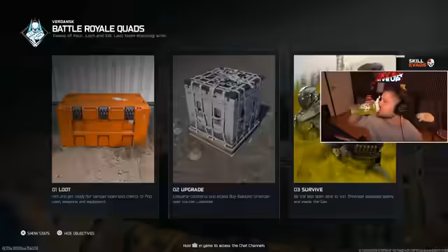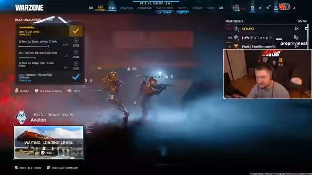 00:17:40Aufgrund technischer Probleme mit den Restreams, die das Kommentar-Team benötigt, muss das geplante Battlefield-Turnier kurzfristig abgesagt werden. Der Streamer gibt den Zuschauern via Discord-Kall die Nachricht und betont, dass eine Verschiebung für den Folgetag angekündigt wird. Als Ersatz und spontaner Content werden Warzone-Runden geplant. Eine kleine Runde Solo-Quads in Verdansk wird gespielt, bevor der Fokus auf das Hauptspiel Avalon gelegt wird.