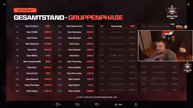 05:10:37Der aktuelle Stand des Turniers zeigt, dass führende Teams wie Enki und Huskas sehr nah an dem Punkteziel von 150 sind. Es wird klar, dass das Turnier wahrscheinlich in sehr wenigen Runden entschieden sein wird. Ein Team muss die geforderten Punkte erreichen und anschließend auch die aktuelle Runde gewinnen, um den Sieg davonzutragen. Die eigene Position ist weiterhin verbesserungswürdig.
