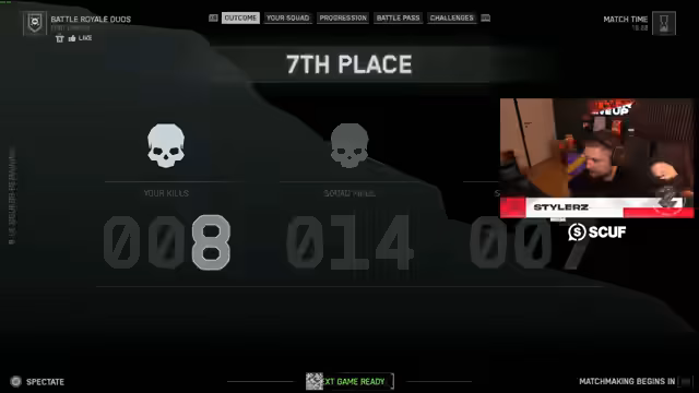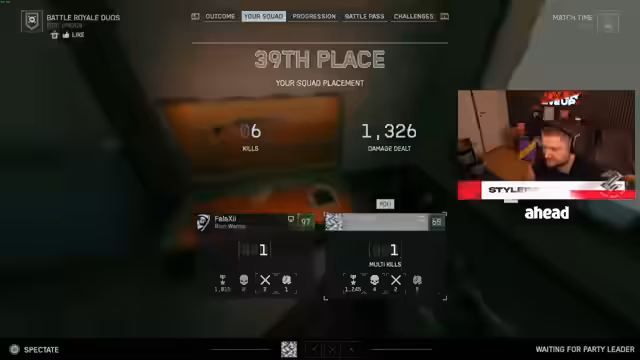 06:39:31Die Spieler beenden die aktuelle Spielsession mit einem Sieg, dem neunzehnten insgesamt und dem vierten an diesem Tag. Es wird über die Streuung von Kugeln auf Controller und Maus/Tastatur diskutiert, wobei der Streamer die Meinung vertritt, dass die Streuung gleich ist, aber der Rückstoß auf Controller geringer sein kann. Die Anzeigefehler bei den Kills in der Übersicht werden thematisiert. Der Streamer verabschiedet sich von seinem Co-Streamer Sebastian und dem Chat, bedankt sich für das Zuschauen und kündigt an, morgen wieder zu streamen. Er weist darauf hin, dass er Farbfilter in OBS verwendet, um das Bild zu verbessern, und verabschiedet sich, indem er den Chat zu einem anderen Streamer weiterleitet.