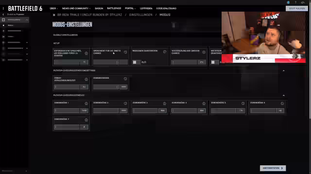 00:08:23Der Stream beginnt um ca. 10:30 Uhr. Es werden Battlefield Custom Games im Red Sack-Modus angekündigt, die um ca. 14 Uhr starten sollen. Der Streamer betont, dass die Lobbys voll werden müssen, damit das Event funktioniert und fordert die Zuschauer auf, teilzunehmen. Es werden bereits einige Namen im Chat erwähnt, die sich für die Partien angemeldet haben. Ein großer Teil des Streams wird der Vorführung der Custom-Game-Einstellungen gewidmet, um den Teilnehmern den Einstieg zu erleichtern.