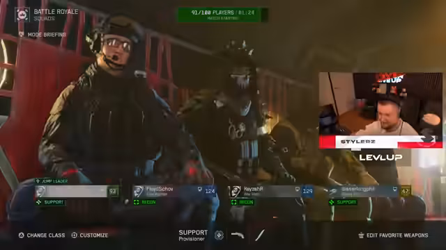 01:46:40Nach Code-Eingabe und technischen Problemen mit Tastaturen wird die Waffenauswahl diskutiert. Der Standard-Revolver wird gewählt. Das Team springt gemeinsam und landet bei Vista Hills. Sofortige Loot-Phase mit Verteilung von Platten, Defibrillatoren und Smokescreens. Frühe Kämpfe mit Positionierung auf Dächern und Nutzung von Drohnen zur Gegnererkennung.