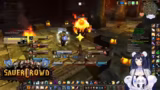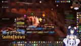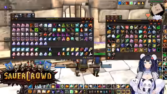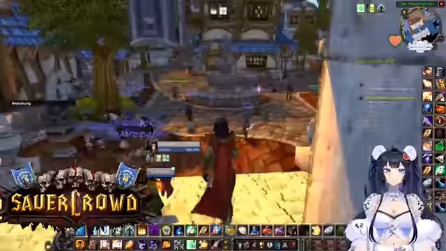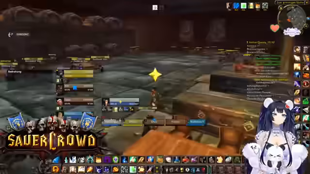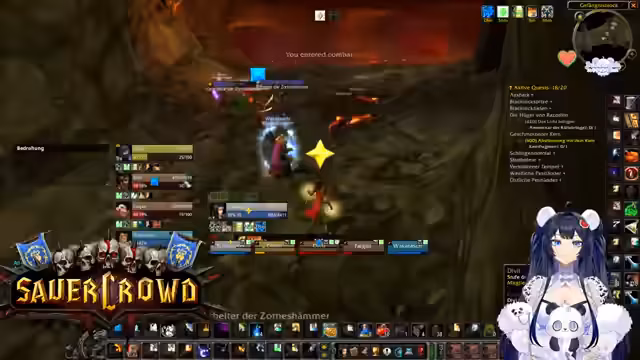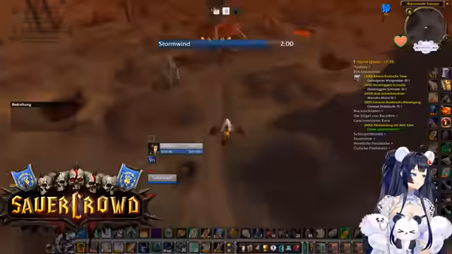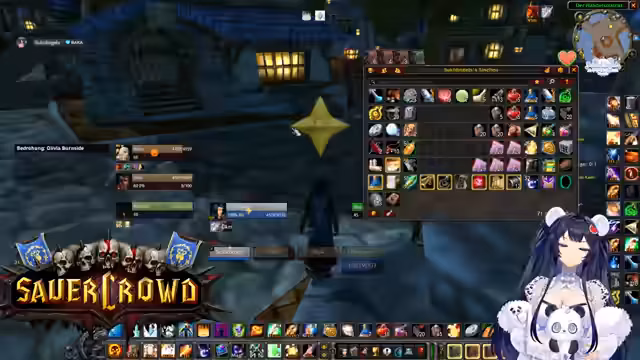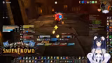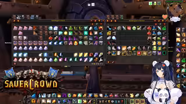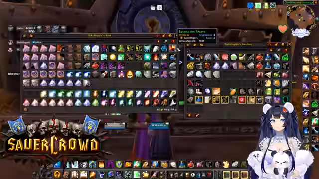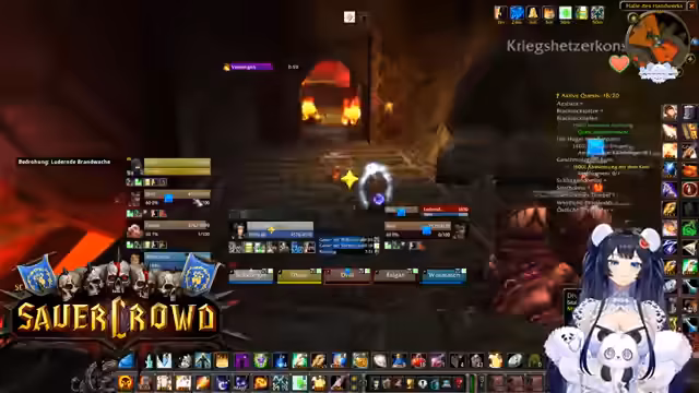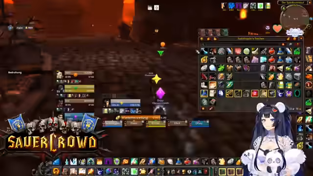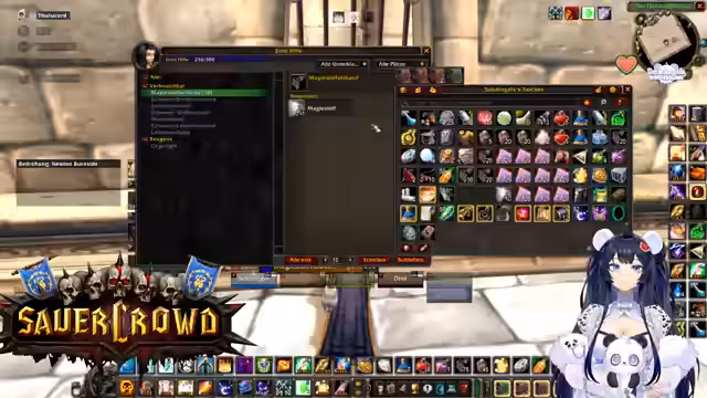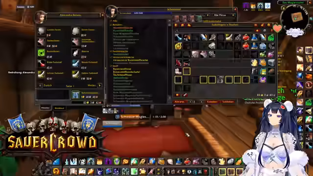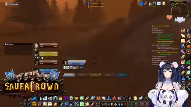 00:34:22Innerhalb eines World of Warcraft-Raids werden die Koordination und Logistiken besprochen. Die Streamerin sucht jemanden, der eine Verzauberung für eine Waffe craften kann und wechselt daher kurz den Spielcharakter. Es finden mehrere Gespräche statt, um die Gruppe zu organisieren, Schlüssel zu verteilen und Pläne für zukünftige Aktivitäten wie BRD-Dungeons zu machen, um neuen Spielern Sicherheit zu geben.