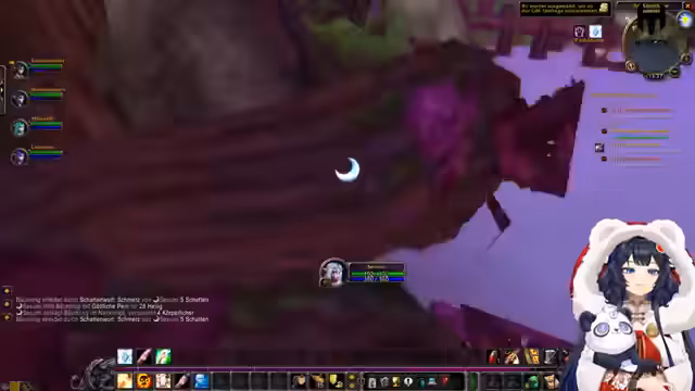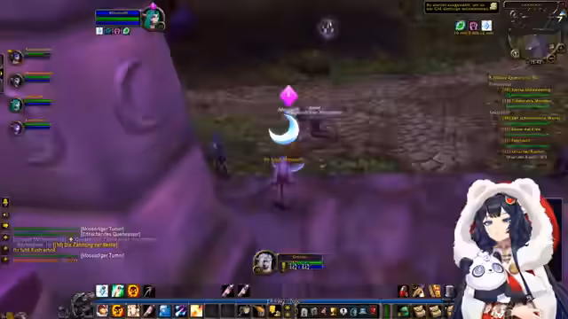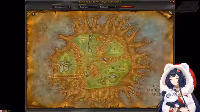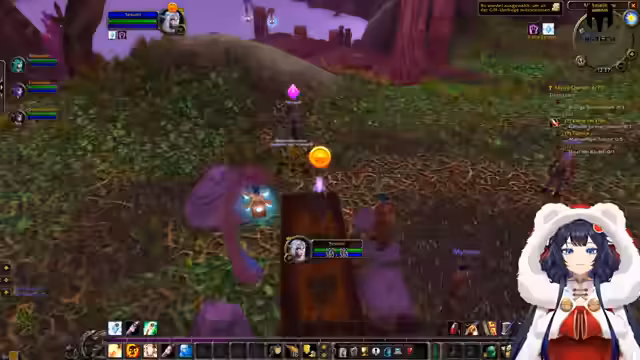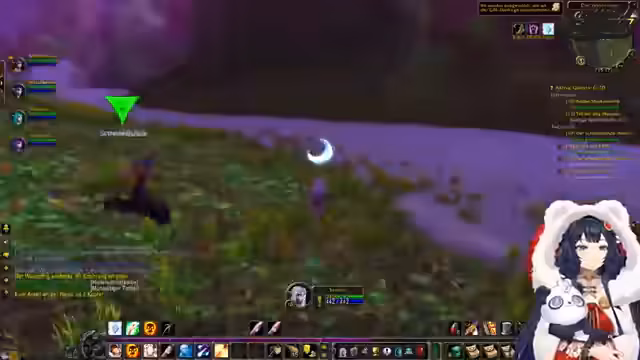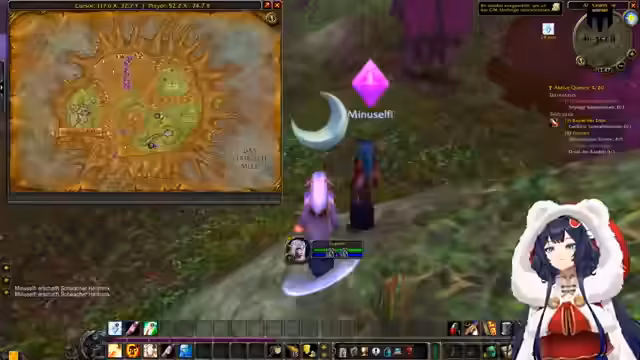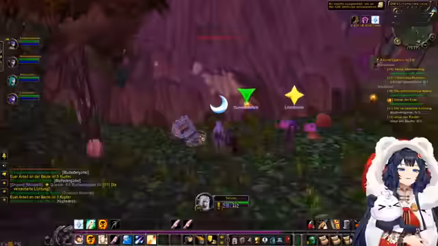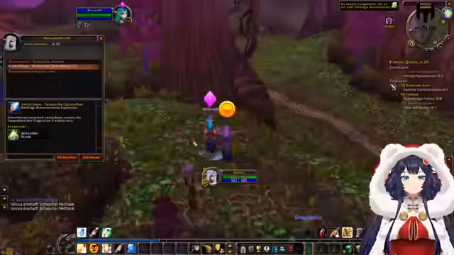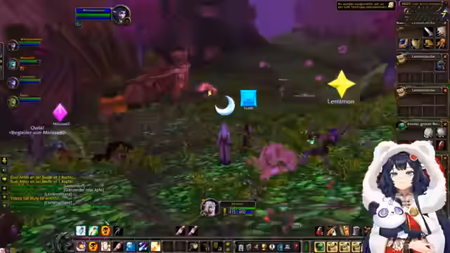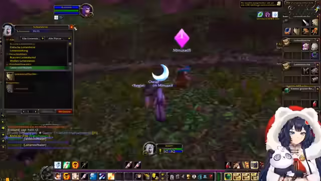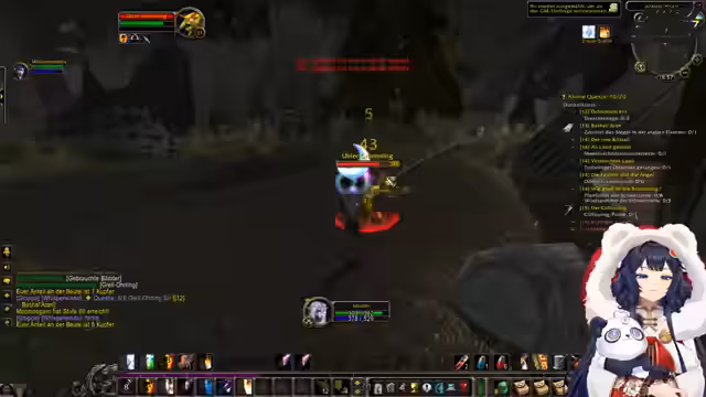 06:46:57Ein Spieler stellt ein selbstentwickeltes Tool für Nachtelfen-Spieler vor, das spielintegriertes Sprachenlernen mit Karteikarten ermöglicht. Parallel werden Questreihen wie "Werkzeuge der Hochgeborenen" im Süden von Teldrassil optimiert, wobei Relikte gesammelt und Geister bekämpft werden. Die Gruppe diskutiert Level-Unterschiede und strategische Ansätze für höherstufige Gegner. Gegen Ende wird ein verstrahltes Reh entdeckt, das sie "erlösen" müssen.