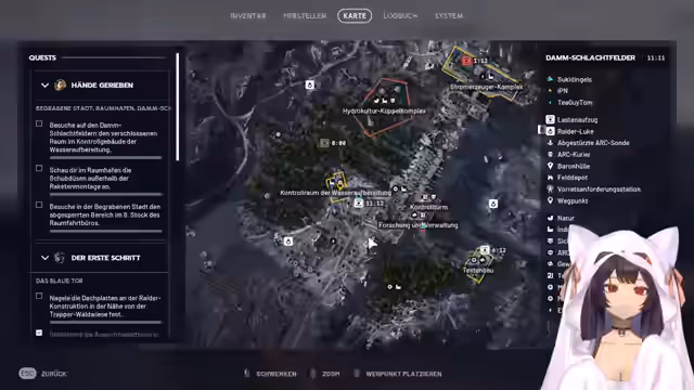 01:12:16Die Spieler begeben sich zum Damm, um dort nach den benötigten Früchten wie Aprikosen und Zitronen zu suchen. Es wird ein Schlüssel für einen Personalraum im Damm mitgenommen, und die Spieler sprechen über die Bedeutung von Erfahrungspunkten, die man durch das Looten von Kisten erhält. Während der Erkundung treffen sie auf einen Loot-Robot, der bei Beschuss Teile verliert, die gelootet werden können und viel XP einbringen. Die Spieler teilen sich den Loot und stellen fest, dass das blaue Schild aus den Drohnenteilen hergestellt werden kann, was als sehr nützlich erachtet wird. Sie suchen weiterhin nach speziellen Körbchen, die in der Nähe von Strukturen versteckt sind und Früchte enthalten. Es kommt zu einem weiteren Kampf mit einem großen Gegner, der erfolgreich ausgeschaltet wird. Die Spieler entdecken eine Stitcher 3 und eine Faro 2, die sie für ihre Ausrüstung mitnehmen. Trotz der Schwierigkeiten, die Körbchen zu finden, bleibt die Gruppe motiviert und setzt ihre Loot-Jagd fort.