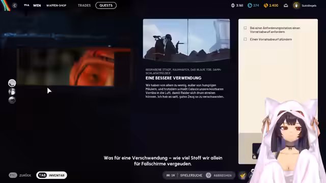 08:52:33Nach einem erfolgreichen Run konzentriert sich der Streamer auf die Verwaltung seines überfüllten Inventars. Er verkauft unnötige Gegenstände wie Schneekugeln und nutzt tägliche Trades bei Celeste, um benötigte Materialien wie Kabel und Metallteile zu erhalten, die für Crafting und zukünftige Missionen unerlässlich sind. Die Diskussion dreht sich auch um die Möglichkeit, einen „Normal Run“ oder einen „Gratis Run“ zu starten, wobei die Vorteile und Risiken abgewogen werden. Der Streamer plant, eine Osprey-Waffe zu craften und Recharger herzustellen, um sich optimal auf die nächsten Herausforderungen vorzubereiten. Es wird auch die Möglichkeit erörtert, das Krankenhaus zu besuchen, um weitere Honissentreiber für eine Quest zu finden.