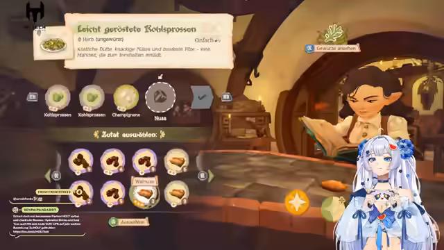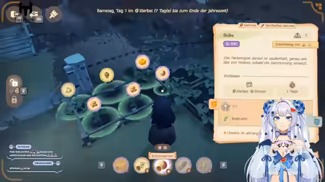 04:31:15Der Stream beginnt mit der Fortführung der Geschichte von Suki und ihrem Stofftier-Olifanten Muma, das im Fluss weggespült wurde. Der Fokus liegt dann auf der täglichen Routine des Sammelns, Erntens und Bauens in einer Gameworld, die stark an Stardew Valley erinnert. Suki sammelt Pilze, Kräuter und Früchte, verwaltet ihren Rucksack und pflanzt neue Saaten an wie Rosmarin, braune Zwiebeln und Rübensamen, während sie ihre Ressourcen auf dem Markt verkauft. Dies unterstreicht den entspannten, farm-sim-artigen Charakter des Streams, der vom normalen Hobbit-Alltag handelt.