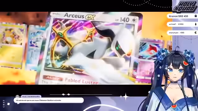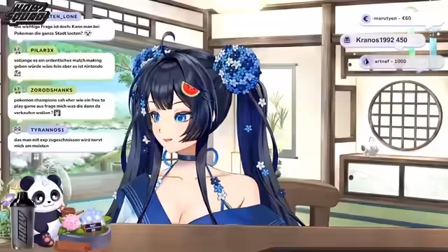 00:17:33Der Stream beginnt mit einer fiktiven Gründungsgeschichte, die an japanische Mythologie angelehnt ist. Es wird die Göttin Amaterasu Omi erwähnt, die ein winziges Licht in einer Wassermelone entdeckt, das zu erlöschen droht. Dieses Licht erhält von Amaterasu einen Teil ihrer Kraft und wird in himmlisches Wesen mit Panda-Ohren verwandelt. Die Göttin gibt dem Wesen den Namen 'Suki' und sendet es in die Menschenwelt, um dort als Licht in der Dunkelheit zu dienen und über die Sterblichen zu wachen.