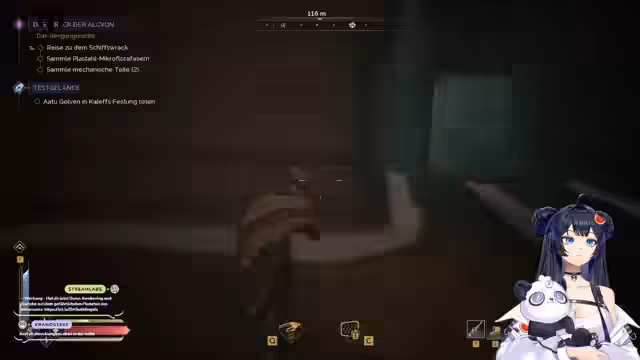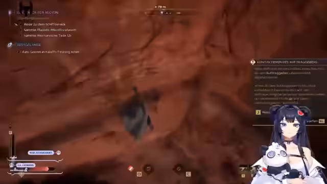 01:32:33Nach einem erfolgreichen Abschnitt in Dead Space wechselt der Stream zu dem angekündigten Spiel Dune: Awakening. Nach der Anmeldung auf einem überfüllten Server wechselt sukidingels zu einem neuen Server und baut eine Basis. Sie interagiert mit dem Händler, nimmt Quests an und erkundet die umgebende Wüste. Dabei sammelt sie Ressourcen wie Metall, entdeckt neue Technologien wie ein Fahrzeug und beginnt, eine sichere Zuflucht für sich und ihre Crew zu errichten.