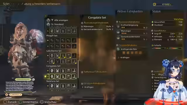 00:41:48Der Streamer berichtet, dass er vor dem Stream zwei Stunden für die Charaktererstellung benötigt hat und erwähnt technische Schwierigkeiten, die zu einer pixelligen Grafik führten. Er experimentiert mit den Grafikeinstellungen, stellt die Auflösung auf Ultra und muss die FPS-Begrenzung auf 60 oder 70 einstellen, da sonst sein Modell und OBS nicht stabil laufen. Anschließend beginnt er mit dem Gameplay, stellt seine Starter-Rüstung zusammen, die ihm schnelles Essen und Betäubungswiderstand bietet, und wählt eine Waffe aus, die ihm gefällt, bevor er seine Jagdmission aufnimmt und sich auf den Weg ins Dorf macht.