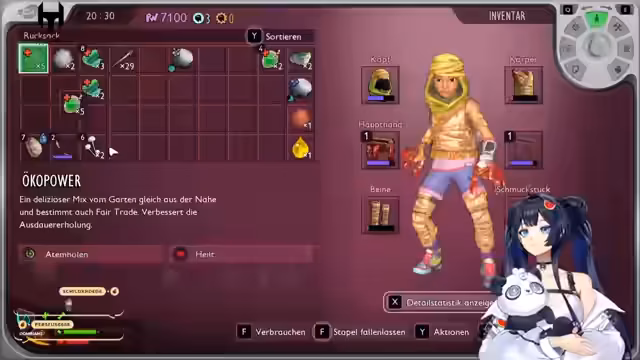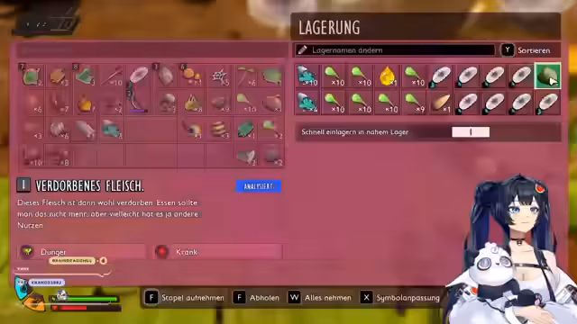 06:31:03Nach dem Tod der Ameise wird das erhaltene Skorpion-Gift zur Verbesserung der Axt auf Stufe 2 genutzt. Des Weiteren werden Süßigkeiten, dicke Stängel und andere Ressourcen im Inventar gesammelt. Der Streamer organisiert sein Inventar über die Taste N, sodass alles automatisch einsortiert wird. Er stellt fest, dass man mit der Stufe 2-Axt auch bestimmte Ressourcen abbauen kann.