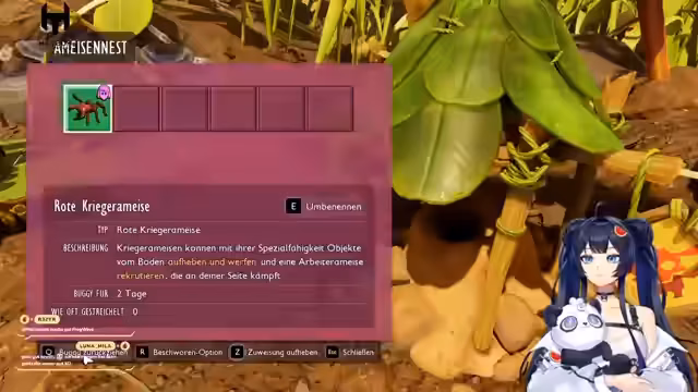 06:27:38Der Streamer interagiert mit einer Ameise, die er mit sich führt, und kämpft gegen verschiedene Insekten wie Skorpione. Dabei verliert er seine Ameise mehrmals, kann sie jedoch wieder zurückholen. Er hebt die Rohstoffe wie Skorpion-Gift und Ameisenbrocken auf, um später seine Ausrüstung wie die Axt verbessern zu können. Das Überleben und der Schutz des Tieres stehen dabei im Vordergrund.