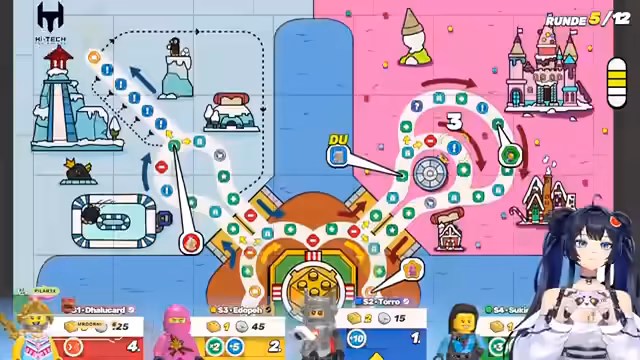 01:07:14Im weiteren Verlauf des Spiels King of the Meat wird der Wettkampf immer intensiver. Die Streamerin analysiert die Spielsituation und erkennt, dass der Sieg nicht nur vom Glück beim Würfeln, sondern auch von cleveren Taktiken abhängt. Es werden Münzen gesammelt und Power-Ups eingesetzt, um andere Spieler zu sabotieren und den eigenen Vorteil zu maximieren. Die Mitspieler nutzen verschiedene Strategien, wie das Kaufen von Sternen oder das Klauen von Sternen bei anderen, was zu einer komplexen und dynamischen Runde führt.