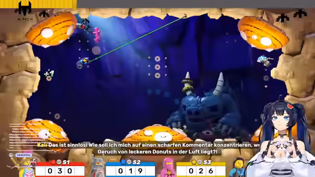 00:22:54Das Spiel Lego Party beginnt. Die Streamerin und die anderen Spieler erstellen ihre Minifiguren mit verschiedenen Optionen wie Gesichtsausdrücken und Accessoires. Während des Spiels treten mehrere technische Probleme auf, insbesondere bei der Controller-Unterstützung, was zu Verwirrung und Unmut führt. Das Gameplay besteht aus verschiedenen Minispielen, die an Mario Party erinnern, mit dem Ziel, durch Gewinne Sterne zu sammeln. Die Mitspieler diskutieren über die Spielmechaniken, wie das Sammeln von Goldsteinen, und es kommt zu interaktiven Momenten wie gegenseitigem Blockieren und Sabotieren.