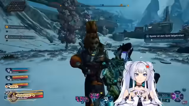 00:33:27Der Stream wechselt zu Borderlands, wo der Streamer mit Dalo spielt und einen gemeinsamen Chat nutzt. Sie spielen eine Hauptquest und kämpfen gegen Gegner, die aus einer verschwundenen Basis respawnen. Dabei wird der gemeinsame Chat von Discord als lauter und unübersichtlicher empfunden, was die Kommunikation erschwert. Das Gameplay wird als chaotisch beschrieben, da die Charaktere ständig sterben und respawnen müssen.