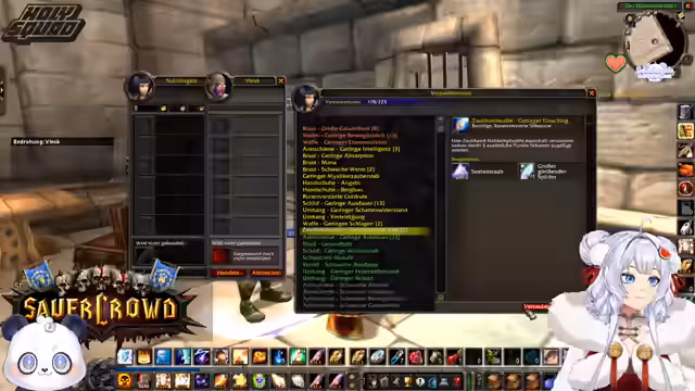 03:12:44Der Streamer beginnt mit dem Craften von Waffen und benötigt dafür Reagenzien wie feuerwiderstandsfähige Tränke und Elementar-Essenzen. Ein weiteres Gildenmitglied wird geholfen, indem ihm verzauberte Gegenstände wie Stiefel mit Ausdauer geschenkt werden. Es werden mehrere Waffen für verschiedene Gildenmitglieder gefertigt und es wird betont, wie teuer das Craften von Gegenständen sein kann.