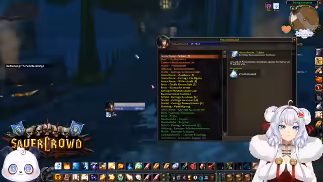 02:29:50Der Streamer bietet verzauberte Ausrüstung für Gildenmitglieder an. Er fertigt Armschienen mit Intelligenz, Umhänge mit Ausdauer und Verteidigung sowie Gürtel mit Intelligenz an. Bei den Verzauberungen für Stiefel entscheidet er sich für Ausdauer, da es eine Verbesserung für den Warrior darstellt. Die verzauberten Gegenstände werden den Spielern in Sturmwind übergeben.