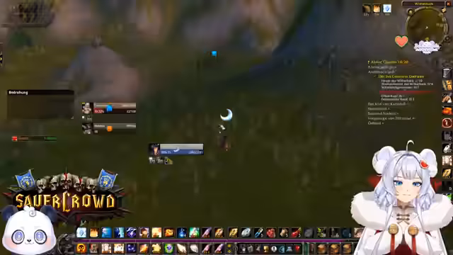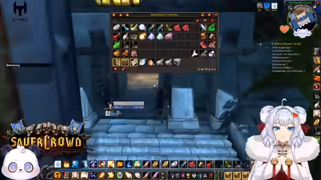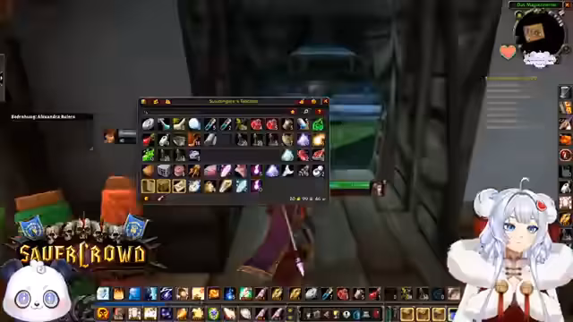 01:00:26Der Streamer aktiviert seinen Ruhestein, um Mitspielern zu helfen, die eine Quest in Schlingendorntal beenden wollen. Gemeinsam reisen sie durch die Gegend, um fehlende Spinnen für eine Quest zu finden. Die Gruppe unterhält sich über Schlafgewohnheiten und den genauen Ort der Questabgabe. Anschließend wird der Plan gefasst, Taschen für die Gildenbank zu craften und diese an einem Treffpunkt auszuhändigen.