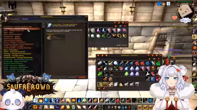 08:31:14Ein großer Teil des Streams widmet sich dem Handwerkssystem. Es geht darum, Materialien wie Stoff (Seidenstoff, Magiestoff) zu farmen, um große Taschen (Säufer-Taschen) zu craften. Dabei wird der hohe Platzbedarf im Inventar als ein zentrales Problem erwähnt. Andere Gildenmitglieder werden erwähnt, die ebenfalls große Mengen an Stoff für die Gemeinschaft sammeln. Der Streamer zeigt sich verärgert über das Fehlen von Experten in der Stadt und die Notwendigkeit, zur Bank zu reisen, um Gegenstände zu lagern. Es werden auch Probleme mit dem Craften von Gegenständen wie 'Schwere Seidenverbände' angesprochen.