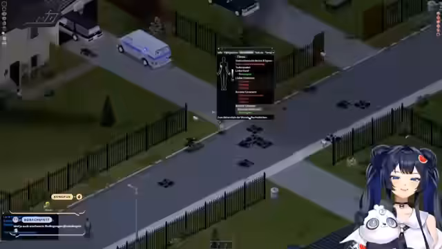 00:25:10Nachdem die technische Verbindung geklärt ist, beginnt die Streamerin mit der Erstellung ihres Charakters auf dem Project Zomboid Server. Sie entscheidet sich für die Rolle einer Ärztin, die sich selbst jedoch nur langsam heilen kann. Sie diskutiert verschiedene Fähigkeiten und Eigenschaften wie Raucher, Langsamer Heiler, Athlet, Stark, Untergewicht, Schwaches Immunsystem, Dünnhäutig, Durstig, Langsamer Lerner, Langsamer Leser, Schusselig und Schneller Fahrer. Nach intensiver Abwägung wählt sie den Raucher und muss feststellen, dass sie in den ersten Minuten bereits gebissen wurde.