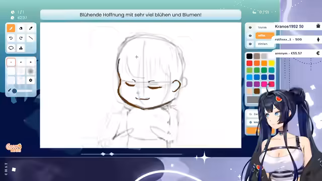 01:43:48Ein Teilnehmer wird scherzhaft beschuldigt, einen "Cheatcode" verwendet zu haben, um mehr Zeit zum Zeichnen zu erhalten. Der Spendenstand erreicht 1270 Euro, was 42 Prozent des Ziels in nur zweieinhalb Stunden entspricht. Die Begeisterung über die 29 Spenden ist groß, und es wird das Ziel von 200 Prozent des Spendenziels humorvoll in den Raum gestellt. Die Präsentation der Bilder beginnt, und die Teilnehmer kommentieren die verschiedenen Kunstwerke. Ein Bild mit dem Prompt "Sprout" (Spross) wird gezeigt, wobei die Schwierigkeit, die Bedeutung des Wortes zu verstehen, humorvoll erwähnt wird. Die Möglichkeit, sich das Speedrun der Bilder anzusehen, wird hervorgehoben, was Einblicke in den Zeichenprozess der Künstler gibt.