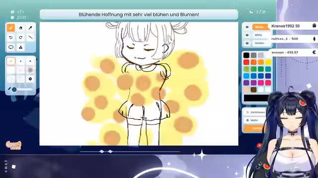 02:20:28Das Thema „Blühende Hoffnung“ inspiriert zu einer Reihe von Kunstwerken, die unterschiedliche Interpretationen des Begriffs zeigen. Ein von Springstulle gezeichnetes Bild, das eine Rose in einer kargen Landschaft darstellt, wird als „mega cool“ und „sweet“ beschrieben, wobei die karge Umgebung als „traurig“ empfunden wird, aber die Rose die Hoffnung symbolisiert. Ein weiteres Werk von Aya, das ebenfalls das Thema Hoffnung aufgreift, führt zu einer humorvollen Diskussion über „Cheatcodes“ und „Pay2Win“ in Bezug auf die schnelle und beeindruckende Erstellung der Kunstwerke. Die Zuschauer sind fasziniert von der Vielfalt und Originalität der Beiträge, die trotz des gleichen Themas einzigartige Perspektiven bieten. Die Werke werden als „Meisterwerke“ bezeichnet, und es wird überlegt, wie diese in Zukunft ausgestellt oder als Prints angeboten werden könnten.