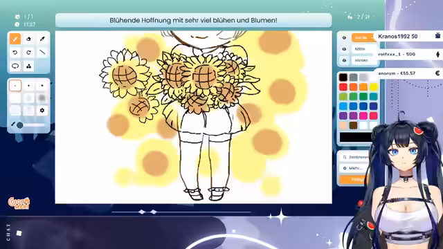 02:28:41Ein Prompt, der einen „Regenbogen aus verschiedenen Blumen“ verlangt, stellt die Künstler vor eine interessante Herausforderung. Das von Lien gezeichnete Bild, das diesen Prompt aufgreift, überrascht die Zuschauer, da es keinen offensichtlichen Regenbogen zeigt, aber dennoch als „echt süß geworden“ gelobt wird. Die Diskussion dreht sich um die Interpretation von Prompts und die Freiheit der Künstler, diese anzupassen. Die Blumen auf dem Bild, insbesondere die Krokusse, führen zu einer Diskussion über ihre Farben und ihre Bedeutung. Ein weiteres Highlight ist das letzte Bild, ein „Blumenfeld ohne Hoffnung“ von Penpai, das einen Frosch beinhaltet und als „mega geil“ und „wunderschön“ beschrieben wird. Die Community ist begeistert von der Kreativität und dem Humor der Beiträge, die den Stream zu einem unterhaltsamen Erlebnis machen.