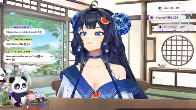 00:17:17Der Stream beginnt mit einer fiktiven Gründungsgeschichte, in der Amaterasu, Göttin der Sonne, ein kleines Licht in die Menschenwelt schickt, um zu lernen, wieder zu strahlen. Der Panda findet das schwache Licht in einer Wassermelone und bittet Amaterasu um Rat. Sie schenkt dem Licht einen Teil ihrer Kraft, verwandelt es in ein himmlisches Wesen mit Panda-Ohren und weißen Haaren und gibt ihm den Namen Suki. Suki wird beauftragt, den Sterblichen als Licht in der Dunkelheit zu dienen und sie zu beschützen.