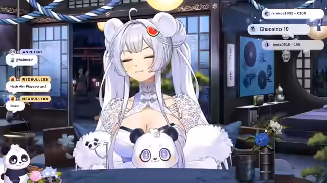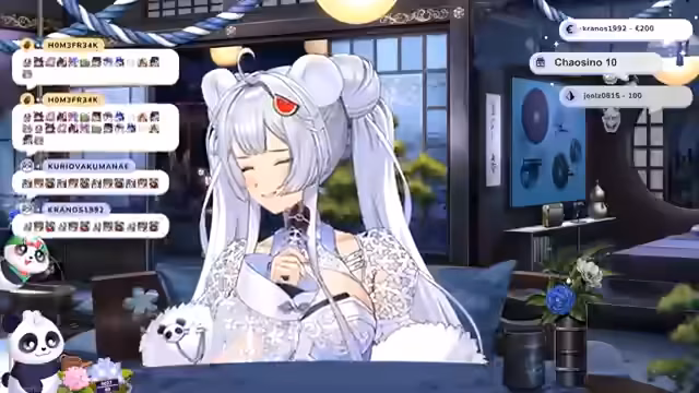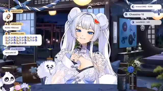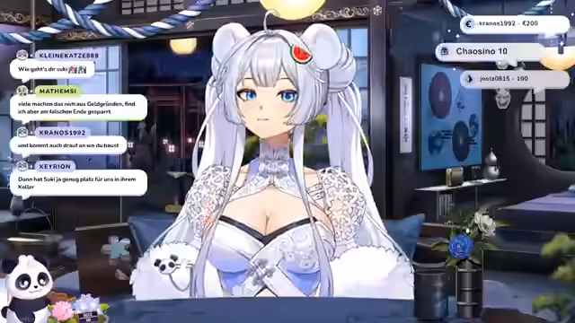 00:17:27Am Anfang streams die Vtuberin die Geschichte ihrer Entstehung. Ursprünglich war sie ein kleines, schwaches Licht in einer Wassermelone, das der Panda fand. Da das Licht zu erlöschen droht, bittet der Panda die Göttin Amaterasu um Rat. Sie beschließt, das Licht mit ihrer Kraft in ein himmlisches Wesen zu verwandeln und schenkt ihr den Namen Suki. Suki soll in die Welt der Menschen geschickt werden, um dort zu lernen, wieder zu strahlen und ein Licht für die Sterblichen zu sein.