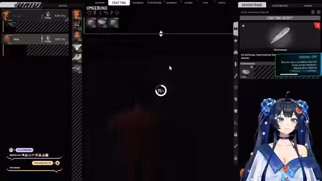 01:53:07Nachdem sie eine besondere Waffe gefunden haben, konzentrieren sich die Streamer auf deren Einsatz und Lagerung. Es wird ein Holster benötigt, um die Pistole zu tragen, was das Herstellen eines Ledergürtels mit Stollenholster erfordert. Hierfür fehlen noch bestimmte Ressourcen wie Metallschrott und Bolzen. Parallel dazu werden andere gefundene Waffen wie ein Bogen und diverse Messer im Inventar organisiert. Das Team sucht gezielt nach den benötigten Craft-Zutaten, um ihre Ausrüstung zu optimieren.