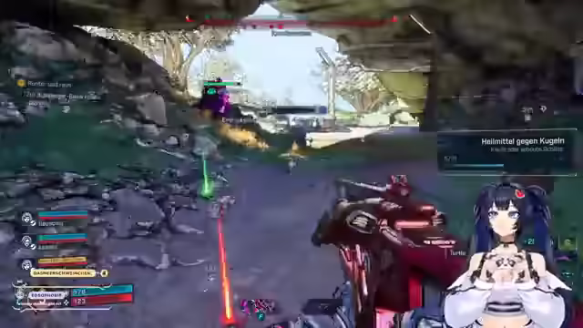 05:08:05Die Gruppe erreicht einen Bosskampf und gibt sich gegenseitig Anweisungen. Suki hat einen Disconnect während eines Dialogs, was zu Spekulationen über den Story-Fortschritt führt. Es wird über die Effektivität verschiedener Waffen diskutiert, insbesondere über einen Revolver und eine lilane Sniper mit Feuer- und Strahlungsschaden. Ein OP-Messer, das bei Wurf kritische Treffer garantiert, wird als besonders nützlich hervorgehoben. Die Gruppe teleportiert sich zurück und es wird festgestellt, dass ein Kompetenzteam für Borderlands benötigt wird. Es wird überlegt, ob ein bestimmtes Messer ein World Drop ist und somit überall gefunden werden kann. Die Schwierigkeit, die richtige Munition zu finden, wird erneut thematisiert. Es wird überlegt, ob die Welt im Spiel sehr groß ist. Es wird über Anime-Serien gesprochen, die die Streamer schauen, darunter "Dr. Stone" und "Demon Slayer", wobei letzterer im Kino gesehen werden soll. Die Gruppe kämpft mit Munitionsmangel und wird von einem Badass-Wachmann angegriffen.