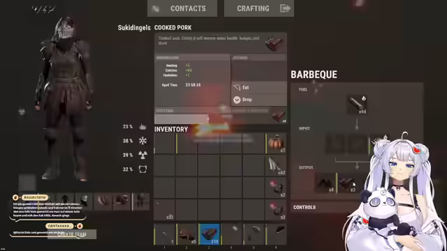 07:43:10Die Streamerin überlegt, wo sie bauen soll, und entscheidet sich gegen das trostlose Gebiet. Sie bevorzugt einen Ort in Wassernähe und möchte die Welt weiter erkunden. Sie erinnert sich daran, dass ihr Spiel abgestürzt ist, während sie ermordet wurde, und entschuldigt sich dafür. Sie plant, nicht mehr auf den Röden zu gehen und erinnert sich an den Namen des Spielers, der sie getötet hat, um ihn gegebenenfalls mit Öl zu übergießen. Sie erhält einen Hut und freut sich darüber, dass das Hühnerkostüm sie als Teil des Spiels fühlen lässt. Sie bietet anderen Spielern Gegenstände an, stellt aber fest, dass ihre Kürbisse und Lagerboxen verschwunden sind. Sie überlegt, ob sie Pilze essen soll, um den Trip aufregender zu gestalten, und betont, dass das Hühnerkostüm ihr beim Wandern helfen sollte. Sie stellt fest, dass Hühner zwar nicht fliegen, aber schweben können. Die Streamerin möchte die Lava bestaunen und sucht nach Bandagen und Kleidung, um sich zu heilen. Sie erhält Mais von einem anderen Spieler und hofft, das Königreich zu sehen. Sie entdeckt eine Kirche und fragt sich, wen sie dort anbeten. Sie stellt fest, dass ihr Speer verschwunden ist und Jennifer ebenfalls im Spiel ist. Sie findet einen Laden und überlegt, was sie kaufen soll. Sie wird von einem großen Eiswall überrascht und flieht auf das Dach. Ein freundlicher Spieler gibt ihr ihren Speer zurück. Sie trifft auf Kira und erkundigt sich nach dem Weg zum Königreich. Sie wird vor einem gefährlichen Mann namens Coconut gewarnt, der Fahrräder stiehlt. Sie findet die Kirche, die sie bereits beim letzten Mal entdeckt hat, und erinnert sich an ein Angebot, der Kirche beizutreten, um einen Bonus von 50 Steinen zu erhalten. Sie fragt sich, was der Blood God ist.