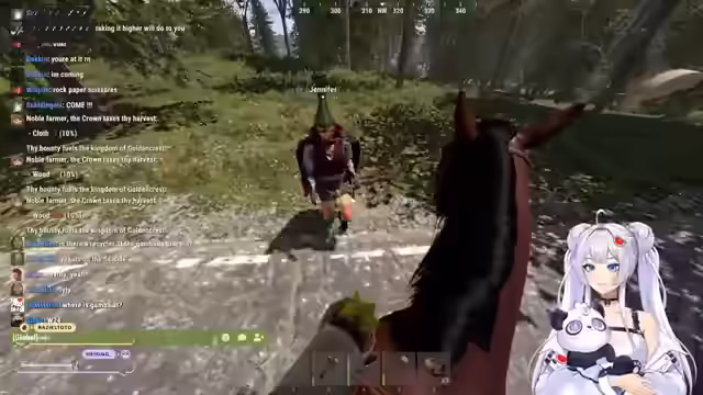 07:11:24Die Streamerin und Brew treffen auf Akka und bringen Snacks mit. Sie erhalten ein Ei und einen Pokestick als Geschenk. Es wird über verschiedene Gegenstände und Ereignisse im Spiel gesprochen, darunter ein Knochenmesser, Baby Back Ribs und ein Stray Gerbil. Die Streamerin tötet Spielfiguren und es wird über die Konsequenzen diskutiert. Sie benötigen weitere Ressourcen und stellen fest, dass ein Messer aus menschlichen Knochen hergestellt wurde. Es gibt Geschichten über Wildschweine, die Stiefel tragen, um Menschen nachzuahmen. Sie teilen ihre Gewinne und finden weitere Ressourcen. Es wird festgestellt, dass es anscheinend zwei Königreiche gibt. Sie erkunden die Karte und treffen auf einen Horse Guy, der sich als Faster vorstellt. Faster bietet ihnen an, eine Kiste zu holen und gibt ihnen ein Pferd. Die Streamerin und Brew treffen auf Master Nora, die ihnen Geschenke macht und sie zu ihrem Apprentice ernennt. Sie fühlen sich sicher und geschützt durch Master Nora. Es kommt zu einer Auseinandersetzung mit einem anderen Spieler, der Master Nora beschuldigt, gefährlich zu sein. Master Nora verteidigt sich und betont, dass sie in Notwehr gehandelt hat.