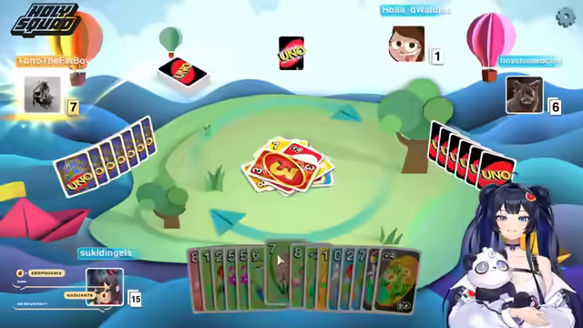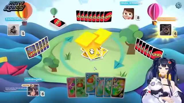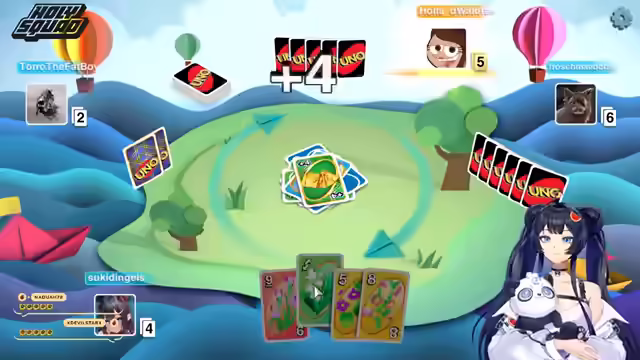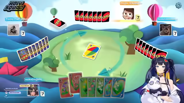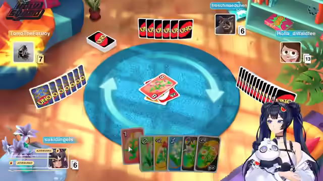 00:37:18Zunächst wird das Spiel Make It Meme gespielt, bei dem Meme-Bilder mit Text versehen und anschließend bewertet werden. Es wird überlegt, ob das Spiel mit Holla fortgesetzt oder zu Uno gewechselt werden soll. Johanna (Holla) bringt Essen mit und verspätet sich deswegen. Es gibt Schwierigkeiten beim Beitritt zur Lobby des Spiels, technische Probleme und Verwirrung um die Rollenverteilung im Spiel. Es wird über die Regeln und Designs von Uno diskutiert und verschiedene Spielmodi ausprobiert, darunter Uno Flip und das Hinzufügen der 7er-Regel. Es gibt Probleme mit Zweierteams und dem korrekten Starten des Spiels. Während des Spiels gibt es immer wieder lustige Kommentare und Interaktionen zwischen den Spielerinnen, sowie taktische Überlegungen und Anfeindungen.
