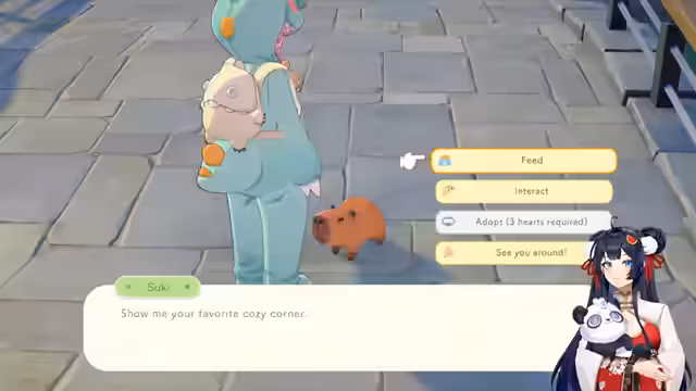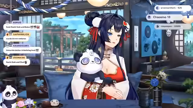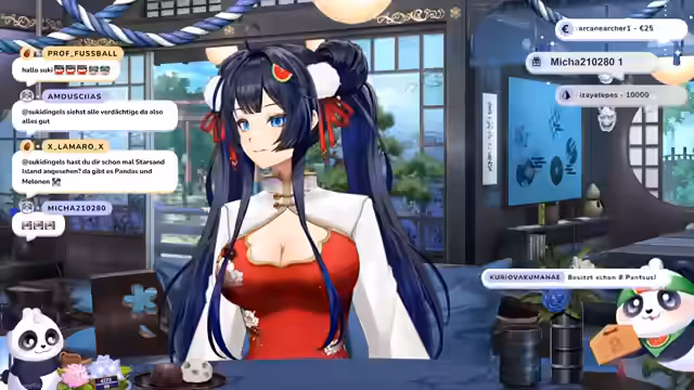 00:18:01Der Stream beginnt mit einer mythischen Erzählung. Amaterasu Omikami ruft alle Tiere ins Himmelreich, um mit ihr auf die Erde zu kommen. Alle Tiere kommen, außer der Panda. Dieser findet in einer Wassermelone ein schwaches Licht, das zu erlöschen droht. Der Panda bringt das Licht zu Amaterasu, die es mit ihrer Kraft füllt und in ein himmlisches Wesen mit Panda-Ohren verwandelt. Sie gibt diesem Wesen den Namen 'Suki' und schickt es als Licht und Liebe in die Welt der Sterblichen.