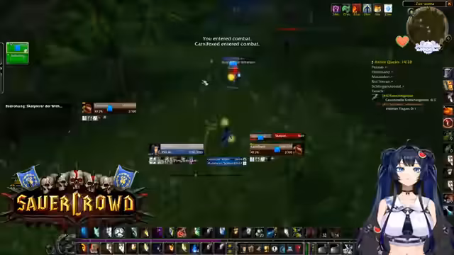 09:23:40Während des Fights in Felwood taucht ein unerwarteter Spieler, genannt 'unser strahlender Retter', auf, was für kurze Verwirrung sorgt. Der Streamer macht sich Sorgen, verflucht zu werden, was das Heilen unmöglich machen würde, was sich jedoch als unbegründet herausstellt. Trotz dieser Ablenkung konzentriert sich die Gruppe weiter auf das Questing, wobei der Streamer die Effizienz des Farmings und das gute Teamwork lobt.