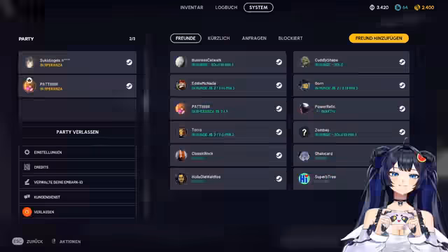 06:34:42Die Spieler versuchen, eine Party zu managen und andere Spieler einzuladen. Es wird erklärt, dass 'Speranza' die Homebase oder Untergrund-City ist, in die man immer zurückkehrt, während 'Online' sich auf den Steam-Online-Status bezieht und der Rest 'in Runde' bedeutet. Es gibt Schwierigkeiten beim Übertragen der Party-Leitung, was dazu führt, dass ein Spieler die Party verlässt, damit ein anderer sie neu erstellen kann. Die Diskussion dreht sich auch um verschiedene Skins und Outfits, wobei ein orangenes Outfit als 'Leuchtkugel' beschrieben wird, die jeden Spieler sichtbar macht. Ein Spieler namens 'Foodie' ist noch am Arbeiten, würde aber mitspielen, wenn er Zeit hat. Es wird auch über den Kauf von Deluxe Editionen und zusätzlichen Skins gesprochen und die Überlegung, den Spacesport erneut zu besuchen, um weitere Outfits zu finden.