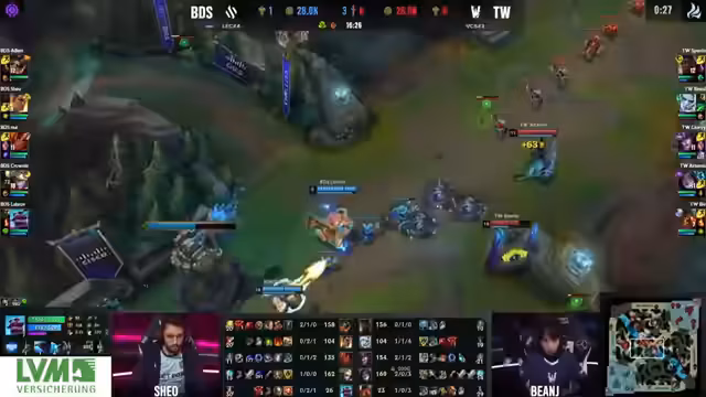 03:05:41Der Stream startet mit einem Thema zu den Aram Challenges, die teilweise verbuggt sind, aber trotzdem als Statussymbol dienen. Der Fokus liegt jedoch schnell auf dem zweiten Spiel der Best-of-Serie zwischen Team BDS und Team Wales. BDS hat das erste Spiel gewonnen und steht somit mit 1-0 im Best-of Three, was ihnen einen soliden Vorteil für den Einzug in die Gruppenphase der Worlds verschafft.